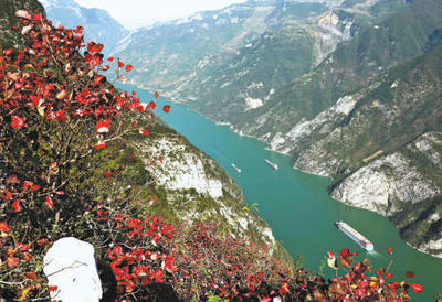 重庆市巫山县,轮船航行在红叶映衬下的长江三峡巫峡水域。