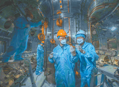 四川省成都市,中核集团核工业西南物理研究院科技人员在新一代人造太阳真空室内解决安装调试过程中的技术难点。