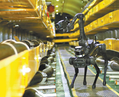 国产四足巡检机器人在北京市丰台区玉泉营电缆隧道内开展地下输电线路巡检。